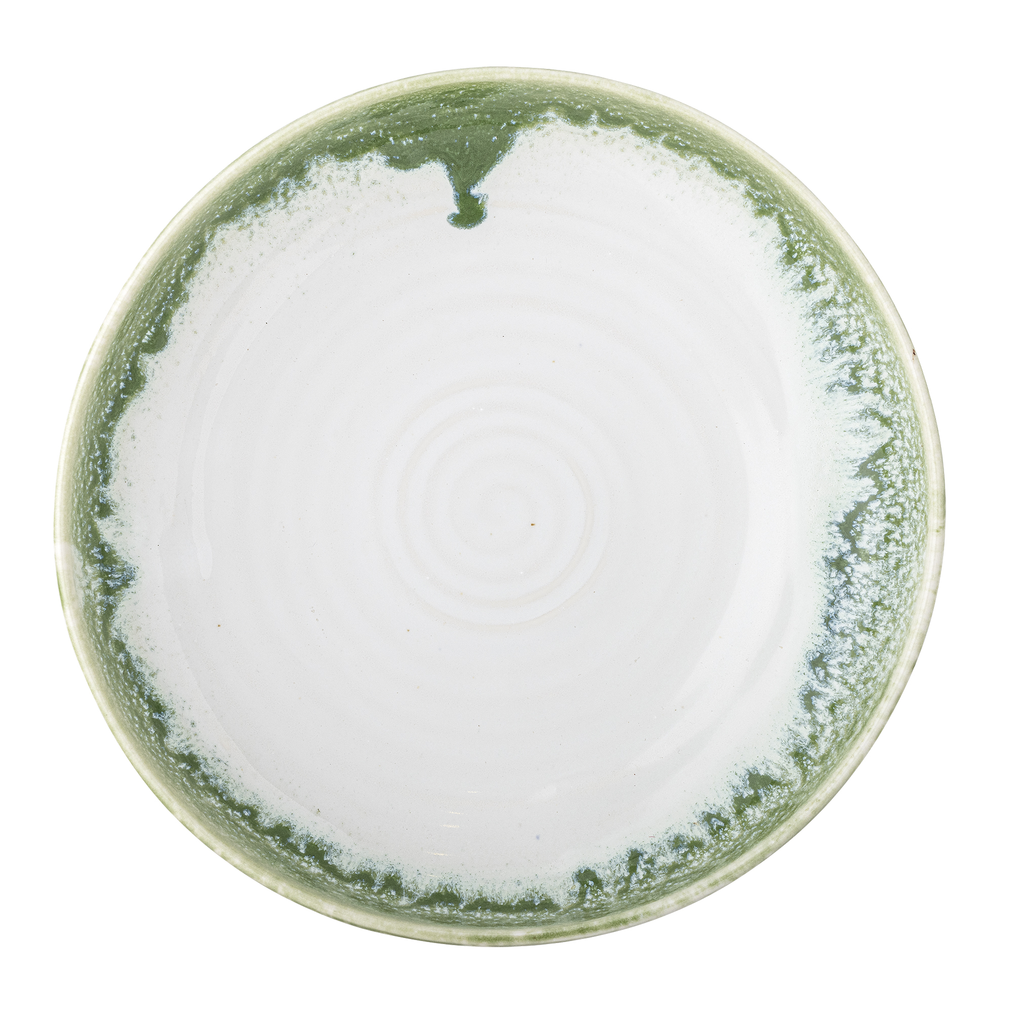 L’assiette de service Prim est un élégant plat en grès décoré à la main avec une glaçure réactive verte, rendant chaque plat unique.